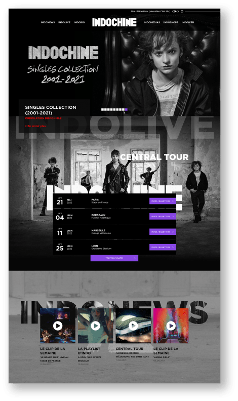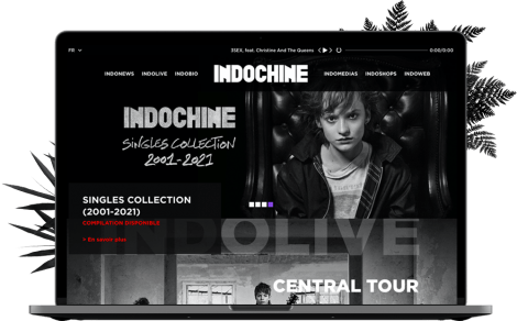 Le célèbre groupe de musique Indochine a confié à l’agence La Jungle la refonte de son site internet ainsi que son eshop. On peut ainsi retrouver la discographie complète, les tournées, les clips etc. Une rétrospective intégralement détaillée sur un site à la hauteur de la carrière d’un groupe culte.